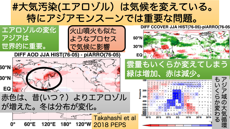 あまり知られていないかもしれないが、大気汚染(エアロゾル)は、気候との関連が深い。特に、大気汚染のひどいアジアでは、大きな問題である。さらに、火山噴火や森林火災なども関連する。雲がキーワード。