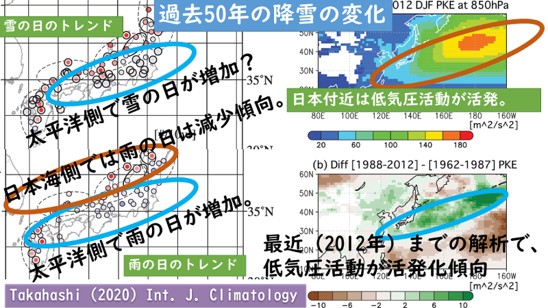 - 温暖化による降雪が降水に変化するだけでなく、降水量(降水頻度)の変化も重要であり、雪の変動を複雑にしていることがわかった。