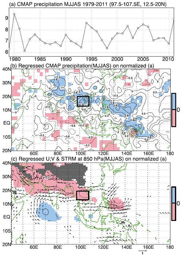 Fig. (a) Precipitation time series generated from theCMAP dataset for the rainy season (May–September) over the reference region of Indochina (12.58–208N, 97.58–107.58E) from 1979–2011. The reference region is used for the regression analysis in (b),(c) and is indicated by a solid rectangle in these panels.