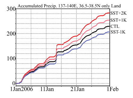 - 4.5-kmの領域気候モデルをもちいて、日本海の海面水温(SST)に対する日本海側の降水量の感度を調べた。実験の初期境界値には、再解析と観測値を用いた。SSTのみを変えた、3つの感度実験(-1K, +1K, +2K)を行い、それらの違いから降水量の感度を定量的に計算した。