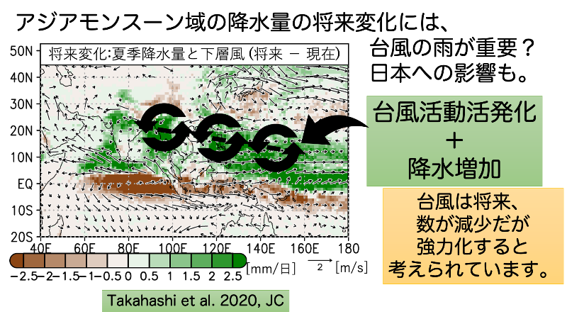 - 日本を含むアジアモンスーン域における、夏季の降水量の将来変化について、台風などの熱帯擾乱活動の将来変化に注目し、高解像度でかつ長期の気候シミュレーション出力を解析した。
