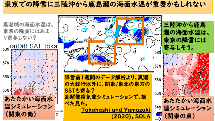 - 関東と東北の東の海面水温が関東地方の気温に影響を及ぼし、東京の降雪に強い影響を及ぼすことがわかった。