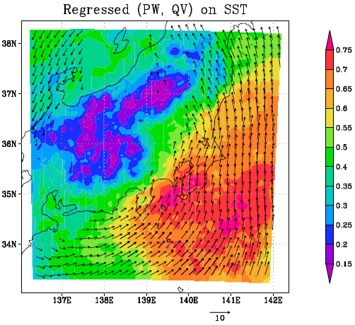 Fig. Regression coefficient of the simulated precipitable water (mm) and vertically integrated water vapor fluxes (kgm-1 s-1) in August on the normalized SST over REF Kuroshio during the 31-yr period from 1982 to 2012. All plotted vectors are statistically significant at the 99.9% level, as determined by correlation coefficients based on 29 degrees of freedom.