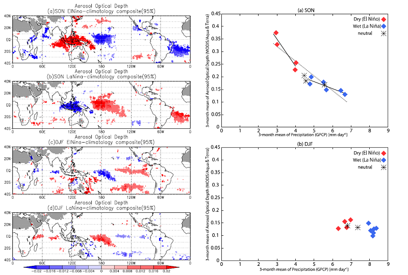 - A three-month composite analysis based on El Niño-Southern Oscillation (ENSO) phases during September–October–November (SON) and December–January–February shows that an increase (decrease) in AOD in the El Niño (La Niña) years was associated with a decrease (increase) in precipitation, particularly in SON over the Maritime Continent. Additionally, CER decreased in the El Niño years over the same region.
