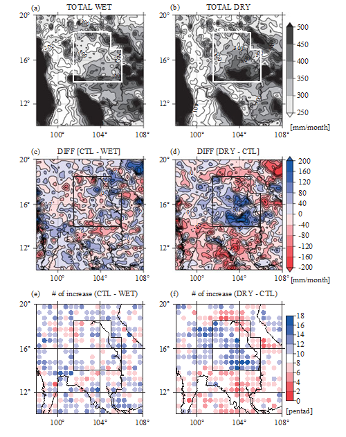 - We performed a control simulation (CTL) driven by reanalysis data combined with current land use and predicted soil moisture data. Two sensitivity experiments, assuming wetter and drier land surface conditions over the Khorat Plateau (northeast Thailand) compared with the current land surface condition, were conducted and examined the impact of land surface changes on precipitation.